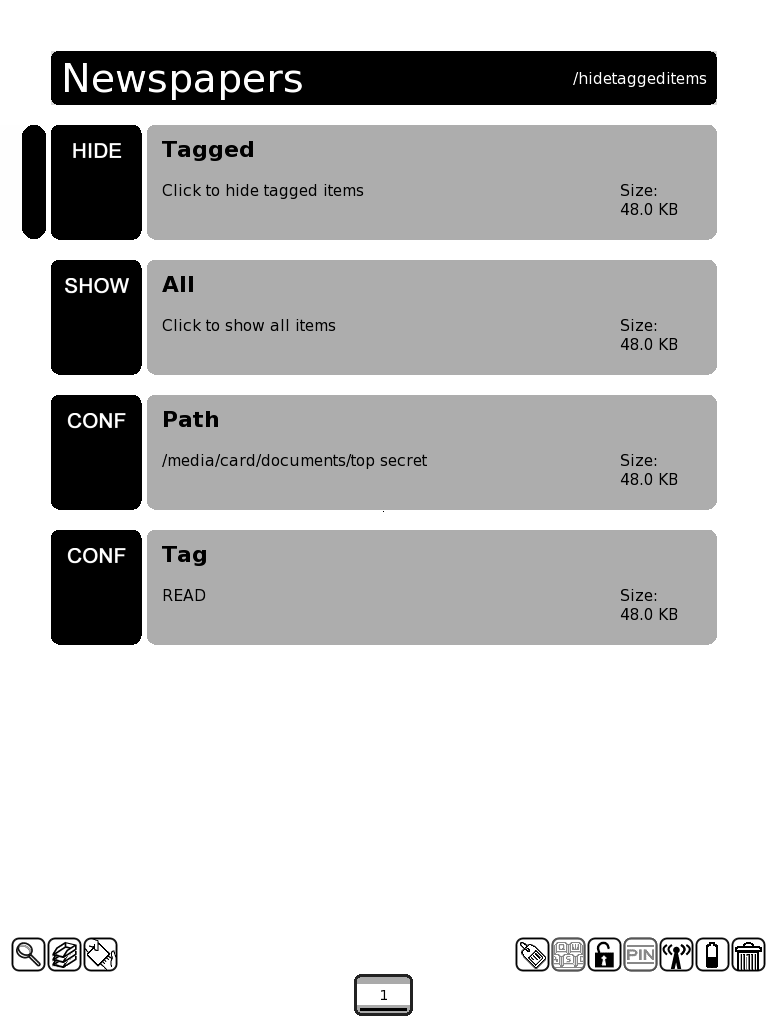 I don't know if someone else already came out with a solution for this. Anyway, here you are mine. I was annoyed by the fact that documents were accumulating in the Content Lister and I was unable to hide read documents. This app solves this issue by parsing the description of docs in a folder of your choice. If it finds a certain tag ("READ" by default) it hides the corresponding item. You can have a look at the screenshots to get a sense of how things work. I would say that the app is easily extensible to support multiple paths and/or tags if people are interested. Let me know. Regards, Michele Update: Version 1.0 may corrupt READ-tagged documents in sub-subfolders. Version 1.1 solves this issue. Please update if you installed v1.0. Last edited by Michele L.M.; 08-21-2008 at 05:21 PM. Reason: Critical fix |