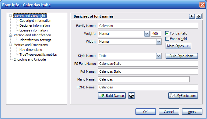 If I delete all the name fields (PS Font Name, Full Name, Menu Name, FOND Name) and click "Build Names", this comes up: Maybe your e-reader uses the "Menu Name" field? I'm not sure... since computer software (Windows or Linux) seem to pair them up by Family Name. Try to match them with whatever FontForge calls them and see what happens. Also, you should probably reboot the device or something after you add the fonts. Just sayin'. It could be something obvious like that. |