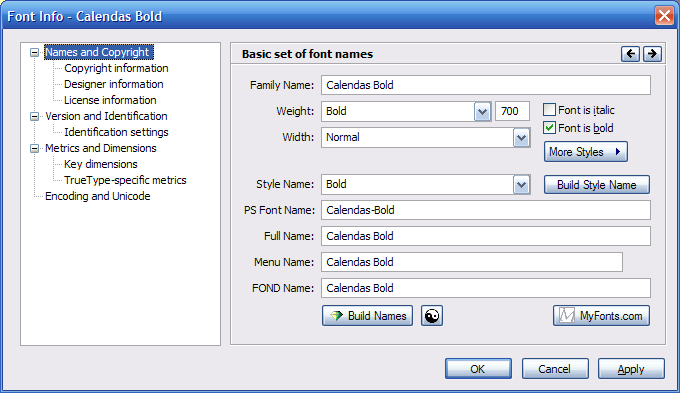 But yeah, it's kinda messed up, having 3 separate entries for the same font. Just change the Family Name (and nothing else, don't bother) from "Calendas Bold" and "Calendas Regular" to just "Calendas". That should take care of it. Last edited by DSpider; 05-03-2012 at 06:55 PM. Reason: "Calendas Regular" |