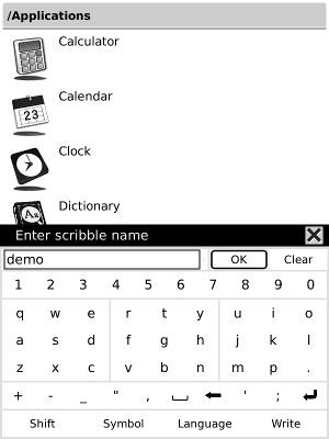 Scribbling in OpenBOOX is a bit more flexible. When you create a new scribble you have to give it a name: The home screen has a Scribbles category containing all the scribbles you created. You can rename them by selecting Rename from the File menu: At this moment there is no search function. Check the Tools menu from within the scribble application for the export function. |