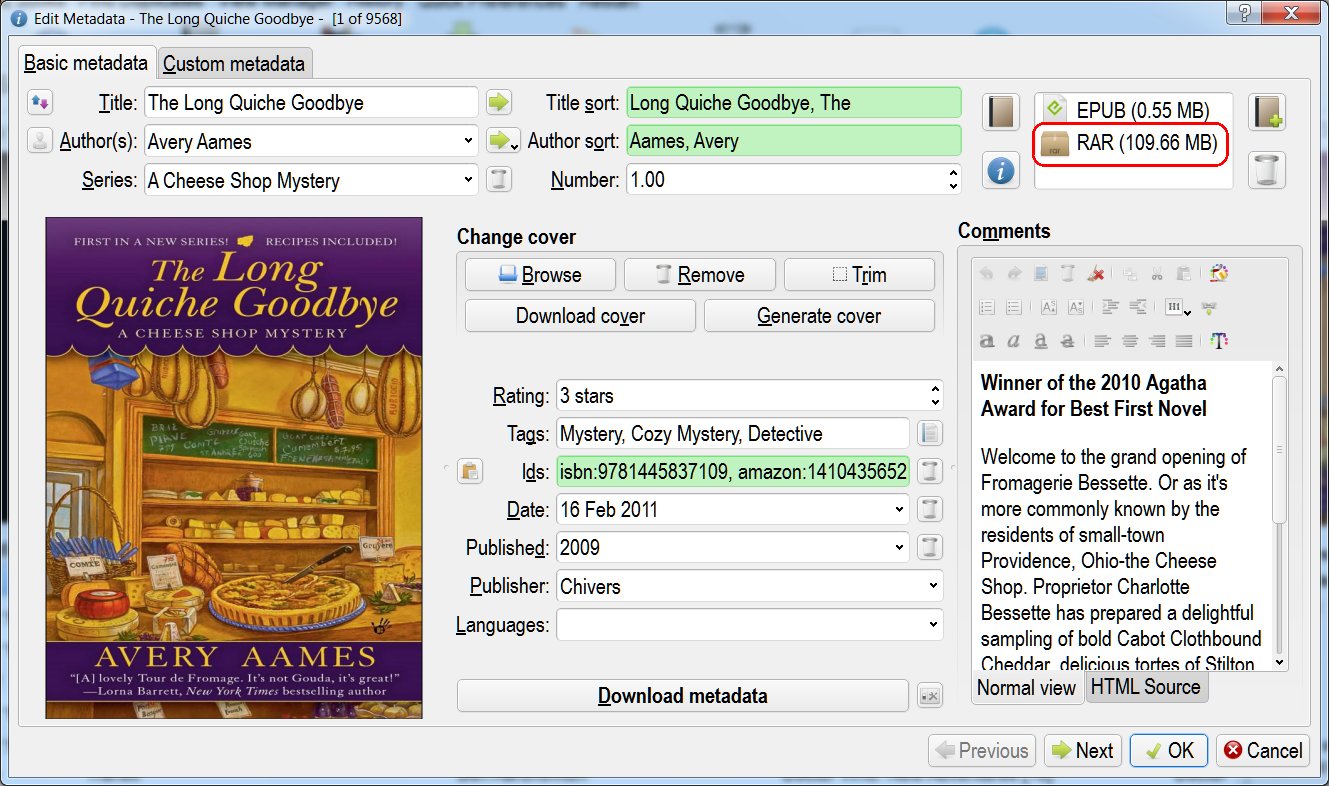 .There are no attachments as such in Calibre (something I very much regret and hope to see one day). However, you can simply add all extra files as if they were other ebook formats (using the "Edit metadata" dialog - just drag&drop). The only limit is that you can add only one file of a given format - but you can always try making adding a .zip, .rar etc. with all files packed together (just watch out if you're adding an archive with e.g. pdfs only - sometimes this would replace the original .pdf if you have such a format for your ebook). |