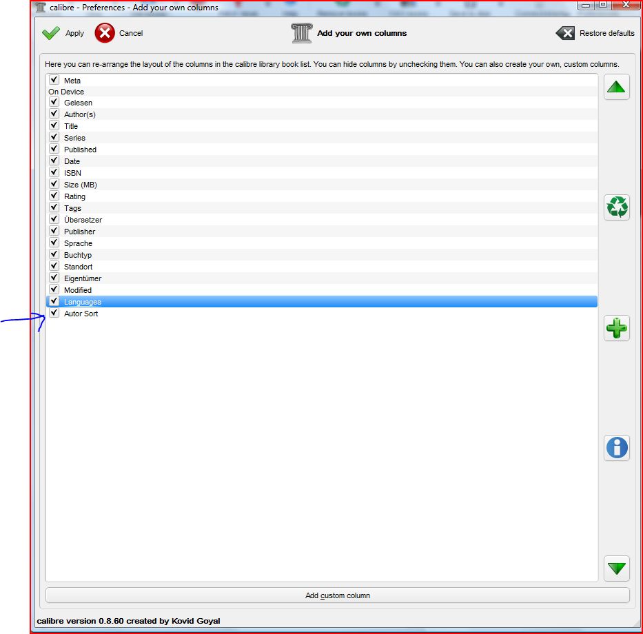Then you will find a new column "Author Sort" at the end of your list (pic3). You can move the column to another position by selecting the column and then clicking on the green up and down arrow in the right. Click on "Apply" after you move the column to the correct position (window top, left).