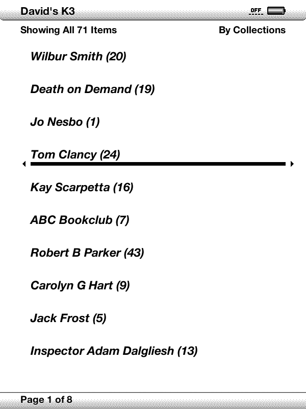 Link here: https://www.mobileread.com/forums/sho...d.php?t=100949 This way my books are labelled with Series Name, #, Title I also entered a 2nd line in the plugboard to shorten the author name to Initial Surname. This freed up how much text I could get on a line. Here is a screen shot of main screen showing my collections This is a look inside the Wiblur Smith Collection This is a look inside the James Lee Bourke Collection Note that as you go down some of the titles are so long they are cut off. Here I have scrolled down within that colelction to highlight one of the lines that was cut off. Note that you get a second smaller line of text with the remaining title details. This is another reason why I shortened the author name. Brewjono. |