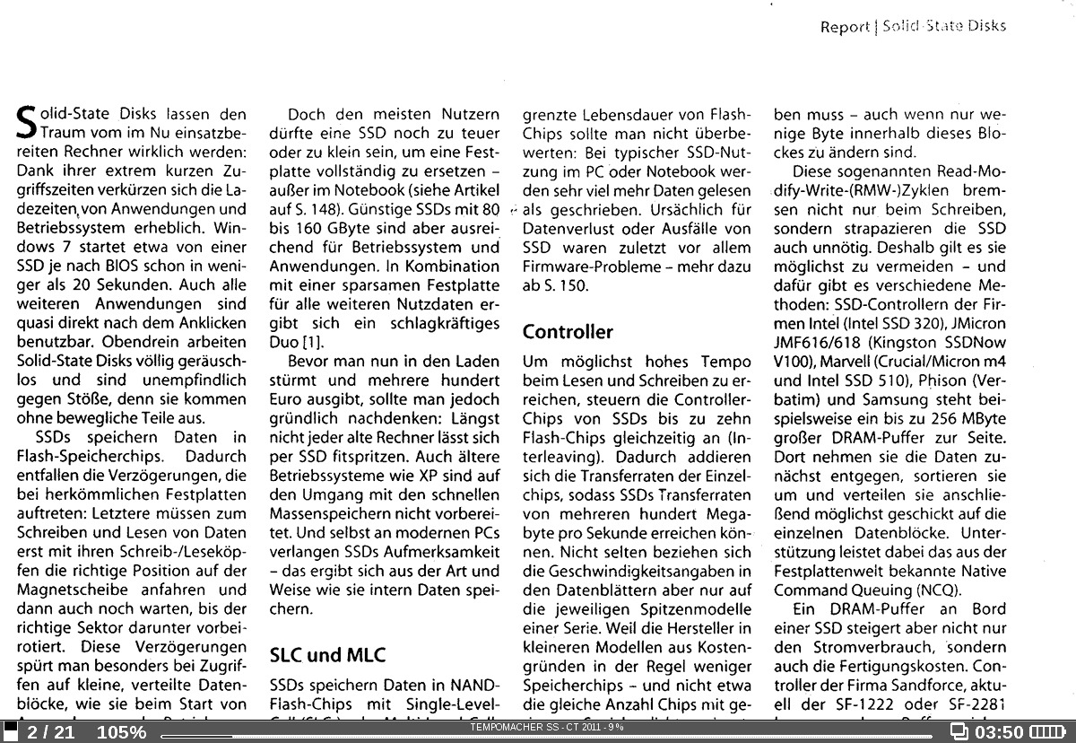 Und das Reflow nur bei Text Sinn macht, versteht sich ja von selbst. Deine Probleme mit dem Reflow und dem Lesen von PDF's kann ich absolut nicht nachvollziehen. Gescannte A4-Seiten lassen sich übrigens im Querformat lesen, nur mal so als Hinweis (hier mal ien gescannter Artikel aus der CT, A4 im Querformat): Also das soll man bei einem 10'' Bildschirm nicht lesen können ![]() Betreff SSH: siehe Update oben. Oh eins noch: es geht nicht darum, das mit Opensource geworben, sondern dass damit gearbeitet wird. Und wer das Prinzip von freier Software nicht versteht, dem steht es ja frei zu anderen Herstellern zu wechseln. Zwingt dich ja keiner. Wenn ich mir deine anderen Kommentare so anschaue, denke ich, dass du mit einem anderen Gerät vielleicht glücklicher wärst. Für mich ist der PB und seine Software eben eine klare Entscheidung für Opensource - und da hab ich auch kein Problem etwas zu warten, bis die Entwicklung voranschreitet. Für mich als Informatiker ist es wichtig, dass ich auch in ein paar Jahren noch Probleme mit und auf diesem Gerät fixen kann, selbst wenn PocketBook von einer größeren Firma geschluckt wurde und keinen Support mehr für ältere Geräte anbietet. Vielleicht wirst ja dann auch du - gestützt durch die Aktivitäten in diesem Forum - diesen Vorteil zu schätzen wissen