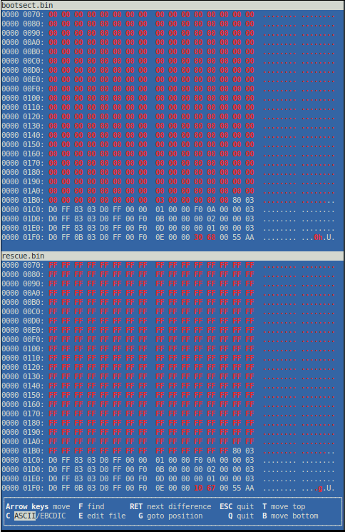 What happened: I was about to try and create an update package which would allow to install an SSH-enabled diags partition without going through all the Windows -> USB downloader -> fastboot mode misery. We already know that the main kernel is at offset 0x41000, the diags kernel at offset 0xe41000 on the device. So all it takes is a bit of dd'ing around. Being the wise guy that I am, I didn't just pack the update.bin, but tried the script using an interactive session first (which allowed me to repair the system even while it was horribly broken, without rebooting first). Being the stupid guy that I am, I forgot to append the "seek" parameter to dd - so instead of writing the diags kernel to where it should be, I wrote it right to the beginning of the "disk", overwriting the MBR, and parts of the main kernel. In fact, having two different versions of first blocks now also gives us a bit more information about the disk layout: the first 65 4k-blocks seem to be mostly irrelevant, with the obvious exception of the partition table within the MBR. And, an interesting observation: the files sent by varnie and geekmaster were actually different. The differences are limited to the Master boot record though, and seem to be irrelevant, but interesting: the entire 446 bytes of bootstrap code were "00" in varnies file, but "FF" in geekmasters. Since the code is obviously not used, this doesn't matter, but I'm curious as to were it comes from. And, the "number of sectors" entry for the 4th partition (userstore) differs, even though the rest is identical for that partition (and the others). Funny stuff