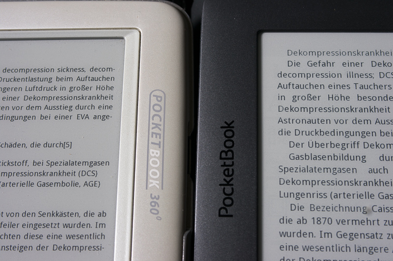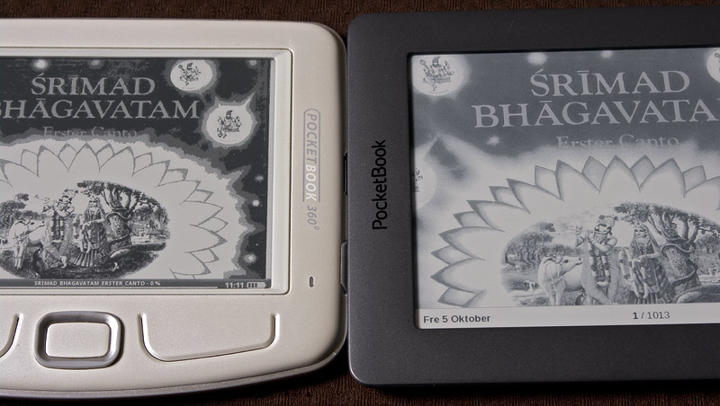 Beim ersten Bild habe ich noch gedacht, daß es nur an der Farbtiefe liegt. Der PB360 hat nur 4 Farben, neuere Reader 16. Bei einem "bunten" Cover muss der PB360 daher deutlich mehr Farben in echtes schwarz übersetzen, was bei einem 16 Graustufen Reader dann eben ein hellerer Grauton wird.