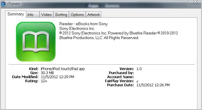 It took me a while to find it in the app store, as it is just called "Reader", and I kept searching for "Sony". The app has a green background with a white outline of an open book. It looks like it was developed by Bluefire. |