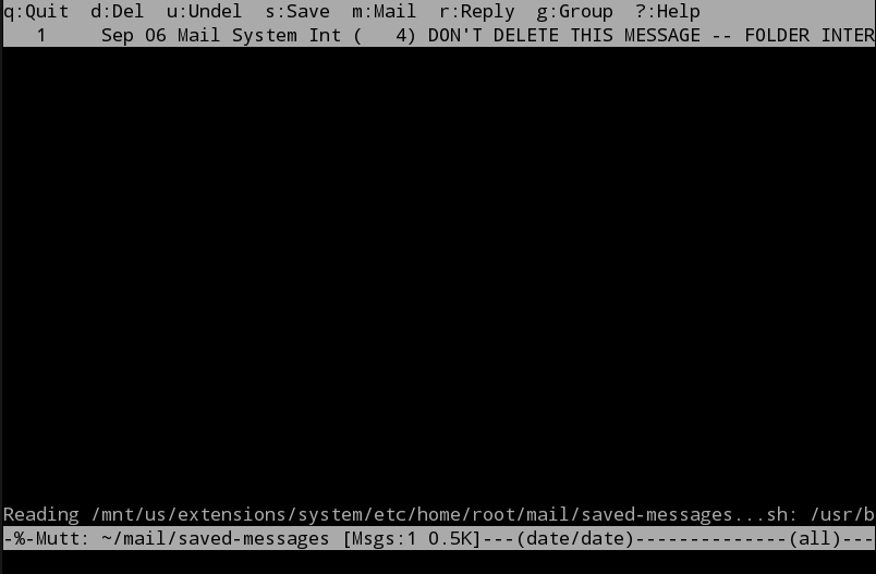 I'll have a quick look. EDIT: [root@kindle root]# cd /mnt/us/extensions/alpine/bin; HOME=/mnt/us/extensions/alpine LD_LIBRARY_PATH=../lib:$LD_LIBRARY_PATH ./alpine Quote: