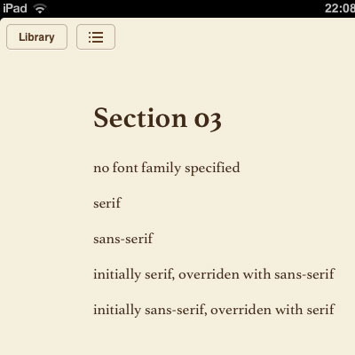 I've got an epub show text in sans in iBooks without embedding fonts nor adding com.apple.ibooks.display-options.xml but somehow in one file, a line of text in sans serif is rendered as serif. There's a test case epub attached. You'll see three pages, nearly identical: Section0001: Code: