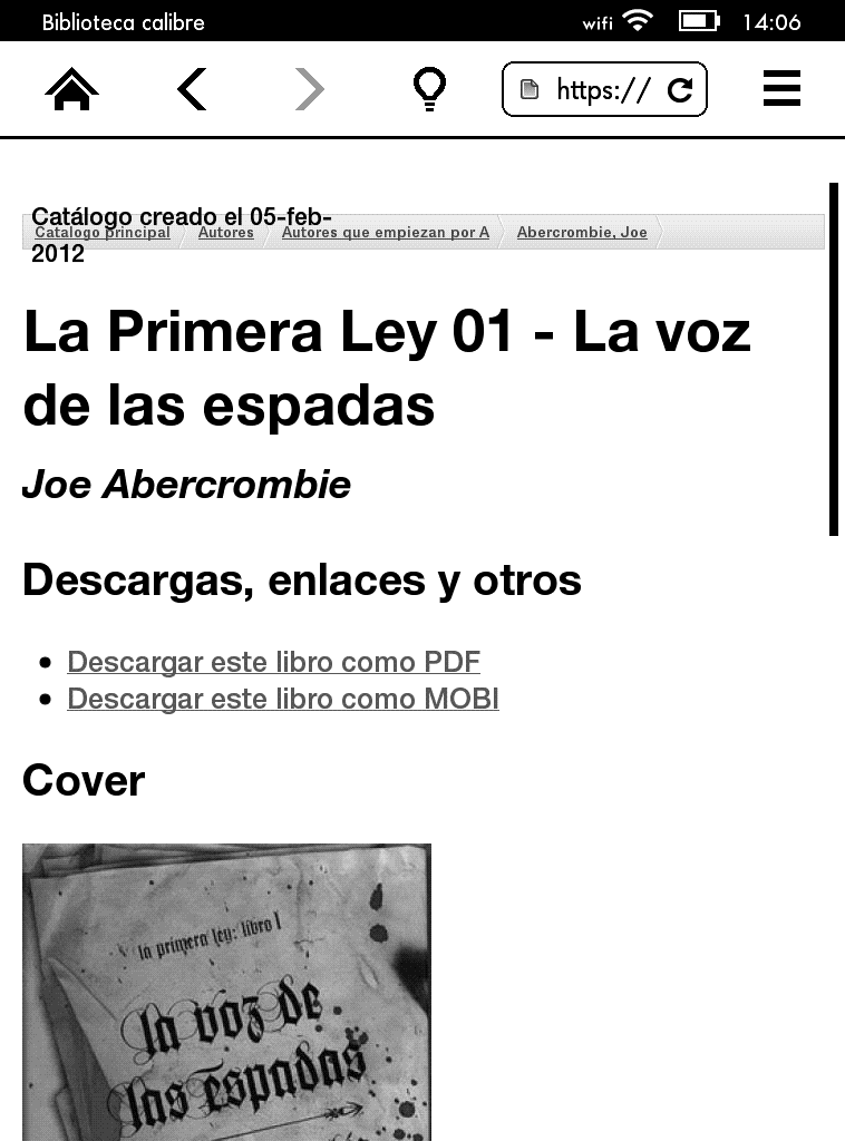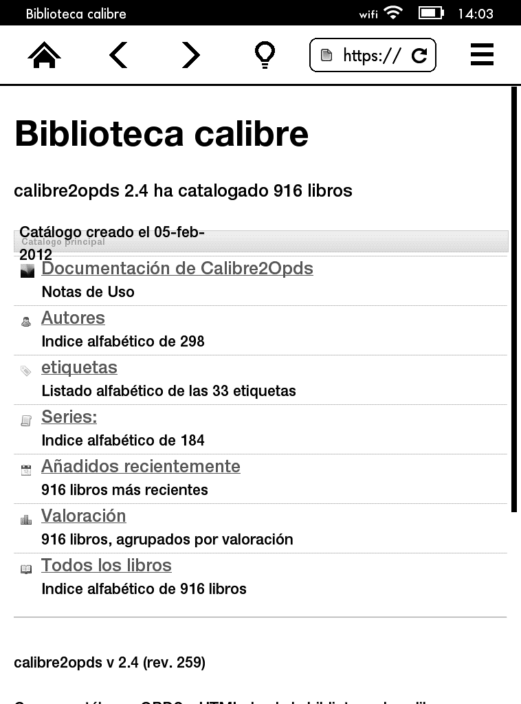 Si creamos una biblioteca con calibre y luego la subimos a DropBox y generamos el catálogo oportuno, tendremos nuestros libros listos para ser visualizadas desde el Kindle. Teniendo en cuenta que cada vez son más los puntos wifi, a alguno igual le saca del apuro. Archivos necesarios: -Calibre2opds -Calibre -Cuenta en Dropbox -Un kindle ;-)) Pequeño tutorial: http://www.elereadercastizo.com/cali...ca-en-la-nube/ http://www.elereadercastizo.com/acce...ca-en-la-nube/ http://www.elereadercastizo.com/acce...or-del-kindle/ Algunas imágenes del resultado(Kindle Paperwhite) |