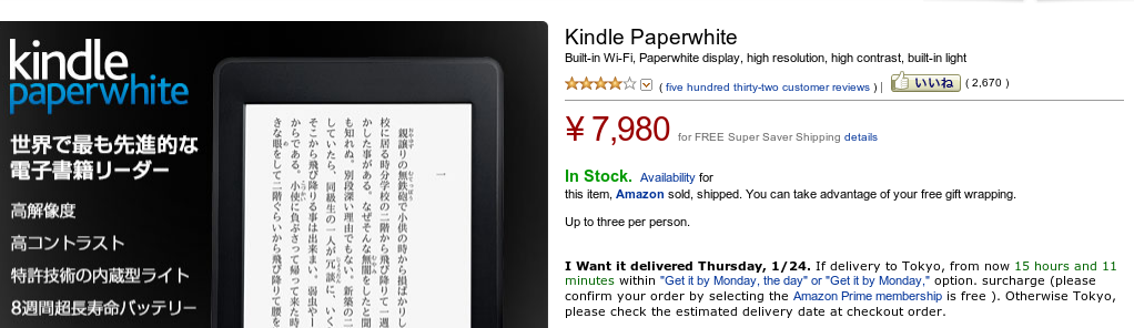 | My Japanese Paperwhite just got delivered today! | Snorkledorf | Amazon Kindle | 23 | 01-25-2013 09:33 AM |