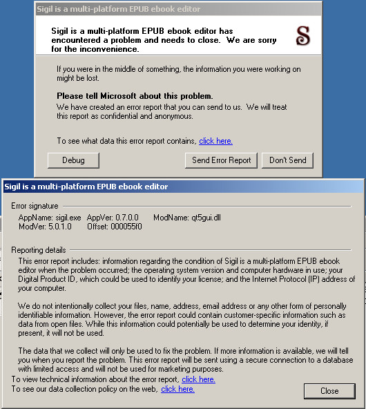 I installed Sigil 0.7.0 on my Windows 7 Home computer and it works great. However, I'm getting the following error when running it on my Windows XP SP3 system. I tried several things including re-downloading the installer and re-installing 0.7.0 after uninstalling 0.6.2, but no joy.