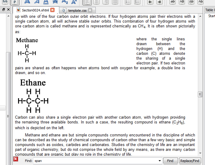 <p class="First6" style="margin-right:2.5em">Carbon can also share a single electron pair with another carbon atom, with hydrogen providing the remaining three available bonds. In such a case, the resulting compound is ethane (C<sub>2</sub>H<sub>6</sub>), which is depicted on the left.</p>