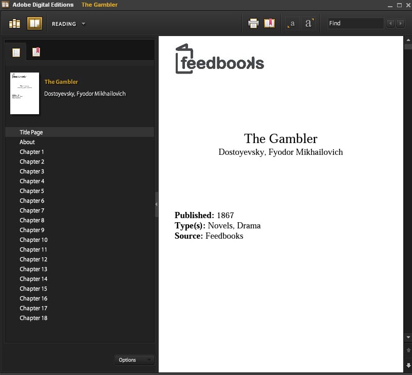 There is a real need for a ePub compliance checker. I'm not sure Dostoyevsky-The_Gambler is a valid .epub. It fails using Lector for example. FBReader can read it, but it currently lacks TOC support which is a bit limiting. |