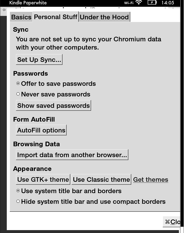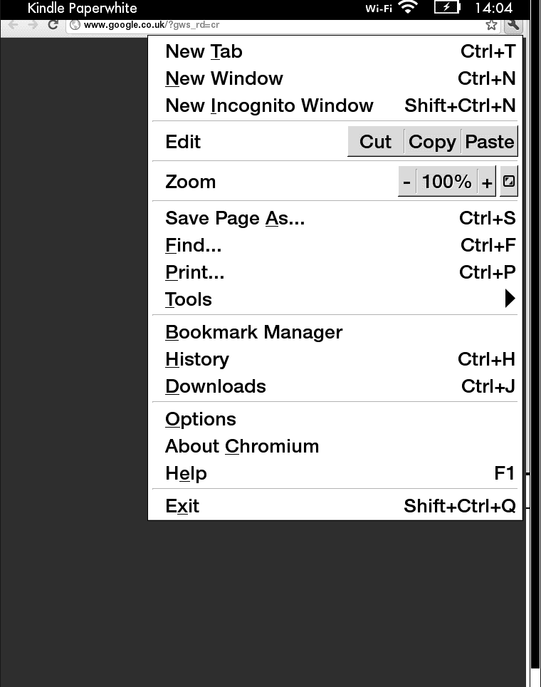 Let me see if I can get this thing to a screenshottable state. GDK_PIXBUF_MODULE_FILE="/mnt/us/extensions/system/lib/armv7l/gdk-pixbuf-2.0/2.10.0/loaders.cache" chromium-browser --temp-profile http://google.com Yeah so with a bit of love (and more skills than me) That could probably be made usable Seems like the only error left is: Quote: