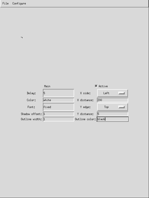 osdctl 0.7.0 osdctl <command argument> ... -h display help -s "string" display a string -b name,val display a bar up to val, named "name" -l name,val display a slider at val, named "name" -t int display the clock for int seconds -c <0|1> (de)activate the osd clock -m <0|1> (de)activate the mixer display -p <0|1> (de)activate the ppp watch feature -a <0|1|2> (de)activate the apm watch feature 1=don't show percent bar; 2=do show it -d interface set the ppp interface, default: ppp0 -A int show battery status for int seconds -e "comm args" tell osdsh to do "comm" with "args" -S "scriptfile" execute commands form scriptfile -x tell osdsh to quit It all still needs repackaging, fixing and making useful... but I wanted to note the commands somewhere permanent since I was sick of remembering them all. Cheers. Update when I have something useful. NOTE: As usual I know nothing about wish, nor any of the other technologies : ) Just to keep things interesting