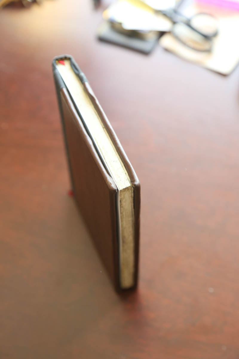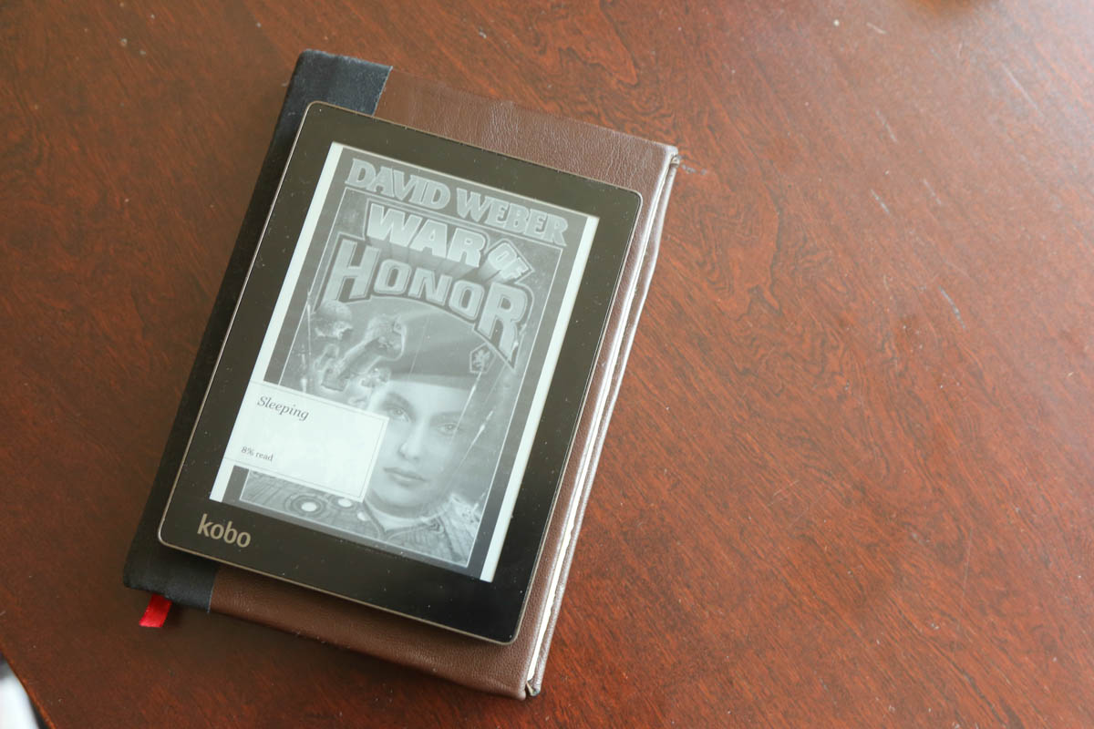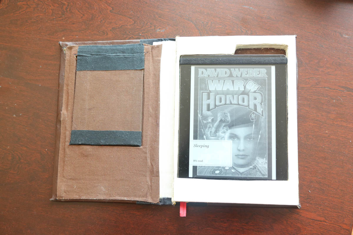 I put a magnet in the right spot to get the Aura to sleep when it's closed, and there's a built in stand for propping the reader up when I'm sitting at a table. It also folds fully back for easy one handed reading. I made the cover out of a book (went to B&N and looked through the clearance until I found something that both fit, and that I wouldn't mind cutting up). Took it apart completely, glued the page block into three sections, cut out the casing. Reinforced it with nails, and added a plastic cover to the page block. Then re-bound the covers with leather, added magnets to keep it closed. Attached the whole thing back together. Stand was made out of a piece of aluminum that I cut and then sanded the rough edges off. Everything is wrapped in either leather or book-cloth. There's also a fake bookmark sticking out of the bottom, primarily to let me know which way is up. Total time taken, about three days, two to three hours a day, and keeping it under a press overnight for the glue to set. |
