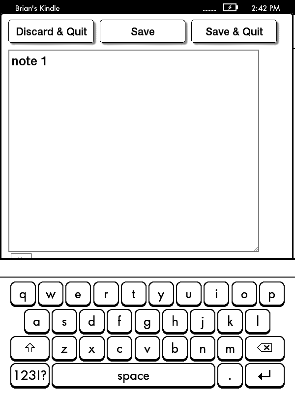 Version v. 0.3 - Fixed "missing buttons on the right" bug - Critical update: Fixed moving-note instead of copying-notes during exports - Better notes icons - Minor improvements Version v. 0.2 - Better overall performances - Notes are now in an editable format in notes folder - Saving state is now notified in a more accurate way As its predecessors, I've written it from scratch for you, Kindle users only! ![]() It's really tiny (73.3 kbyte uncompressed), and as usual based on HTML+JAVASCRIPT+BASH languages. KindleNotes supported gestures: - Swipe-right: bigger fonts - Swipe-left: smaller fonts - Double tap: default fonts You can write up to 5 different notes, and export them also into documents folder or leafad app (if it is installed!). Native predictive text is supported. For best result and loading times, I suggest you to install this app from the whole Kindle Menu bundle pack, v. 0.8 and above. In fact, this app is mainly thought as support tool for Kindle Menu users. TODO: - Add support for text selection - Add copy/past tools (requires text selection before) - Add an alterative, faster keyboard (matchbox-keyboard) - Add a way to import text from other files I'd like to see how does this app show on Kindle Touch device (I've tested it only on my PW), so any screenshot is welcome! Enjoy! Note for developers: I know that the code is quite "rustic" to understand now, I'll make some order before next updates. Last edited by Aeris; 11-13-2013 at 04:29 PM. |