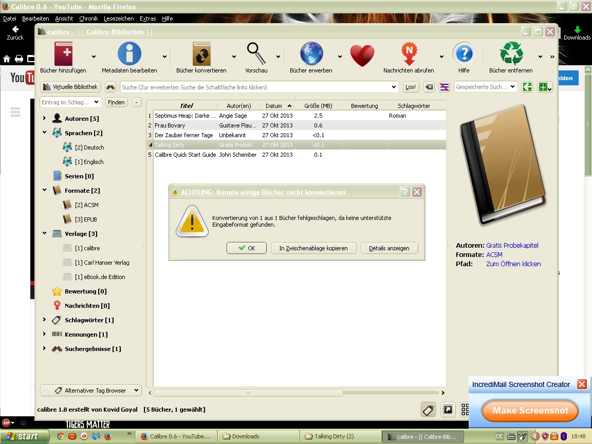 also...ADOBE digital editions kann ich nicht installieren, da fehlt mir zu meinem windowsXP irgend ein "service pack". Habe Calibre installiert....und wenn ich konvertieren will, also Buch ausgewählt, einzeln konvertieren....geht nicht....siehe screen shot