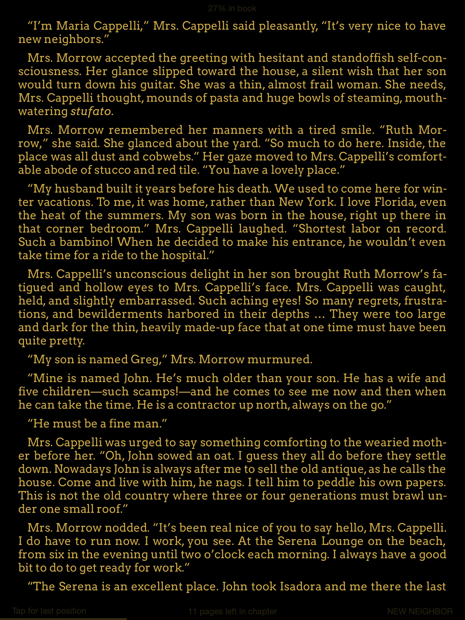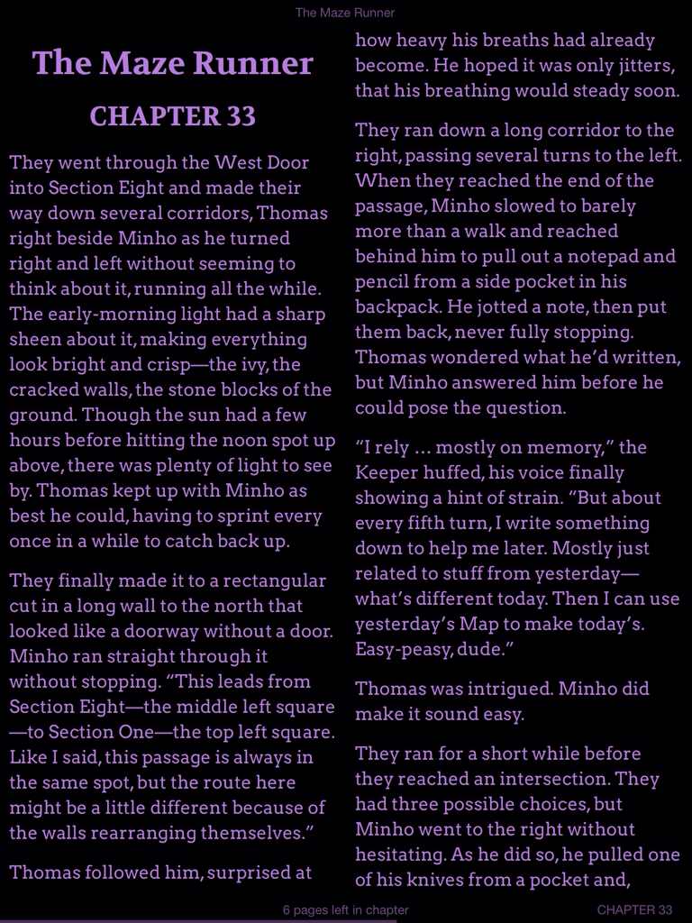 Font colours: Metallic Gold (daytime), Copper (dusk), Asparagus (night) Background colour: Black (waiting for custom textured backgrounds in Marvin; on principle, I dislike all solid-colour backgrounds) Font size and line spacing: yeah, about 36 lines per screen here as well, but on a full-sized iPad, so the font is physically larger, helping to reduce eye-strain Paragraph spacing: typically prefer empty half-line; can't stand zero paragraph spacing Margins: as narrow as possible on all 4 sides Headers and Footers: showing (dim on iPad, bright on iPhone), but I'm waiting for the ability to customise their structure. Particularly missing the permanent display of percentage read; missing at least decimal numbers for percentage read; would appreciate "pages left in book" in addition to "pages left in chapter". |