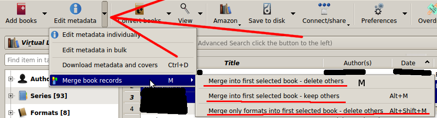 Highlight the books you wish to merge and press 'M'