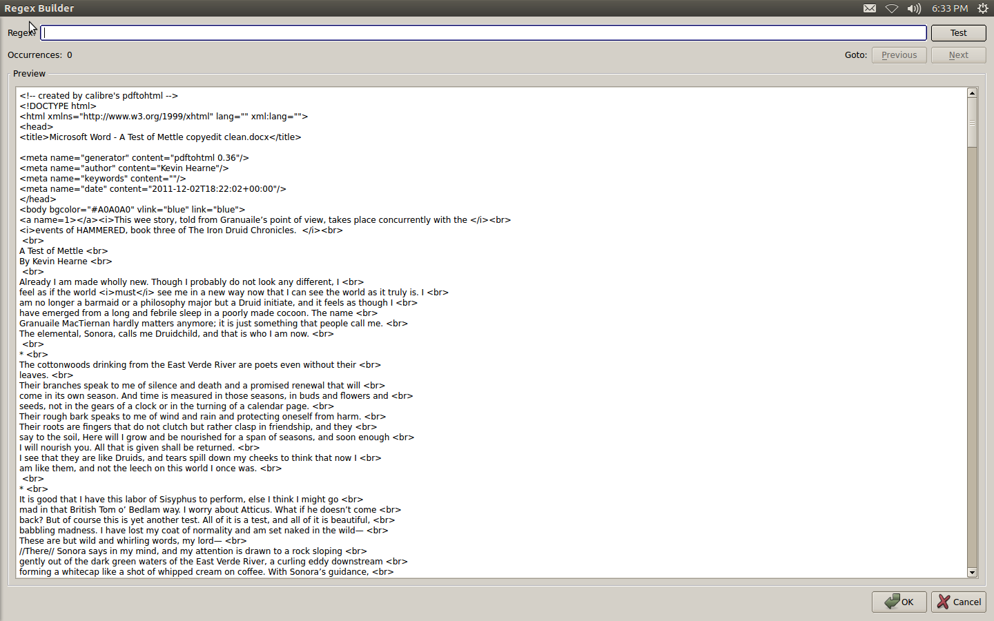 It should open up a window titled Regex Builder. Looks something like the attached screenshot. If the Preview window is blank, maybe calibre doesn't see anything? Although seriously, it should at least show html and body tags.If it doesn't open this window, maybe you need to wait longer for calibre to parse the entire PDF. The one I've shown is a 91 KB, 10-page short story offered for free from the author's website and opened pretty fast, but for a full-blown novel over 200x that size, it might take far longer to load. |