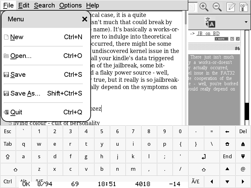 Two things makes it useless for me: 1. Some apps are in background. During start off dictionary.mobi the device stops and no response. The "/usr/bin/wua -l com.lab126.acxwua -s com.lab126.acxManager" (*.mobi) starts only after I close through ssh all apps in background. 2. Ctrl+c crtl+v doesn't work between apps. No clipboard on OS. I would have to additionally create something similar but I've no idea how without interference in apps. Maybe I'll use this information in a different way. For something usable. Thanks. |