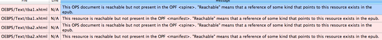 OEBPS/Text/tba1.xhtml This OPS document is reachable but not present in the OPF <spine>. "Reachable" means that a reference of some kind that points to this resource exists in the epub.