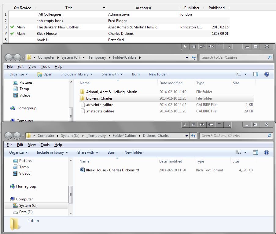 Attachment shows Calibre connected to C:\_Temporary\Folder4Calibre. I sent 2 books to it (green ticks), the contents of C:\_Temporary\Folder4Calibre is in the Windows Explorer windows In your scenario you would then synch the equivalent of C:\_Temporary\Folder4Calibre folder to Dropbox If you don't like the idea of keeping a copy of the format files (epub, pdf whatever) in the Calibre Library folders and in the Connected folder, and in Dropbox then you could remove the formats files from the library - but most book files are fairly small so keeping a copy in the library is like taking out extended warranty on your car - insurance. Whose to say that a future version of Dropbox wont do something that screws up your folder names and or contents. BR |