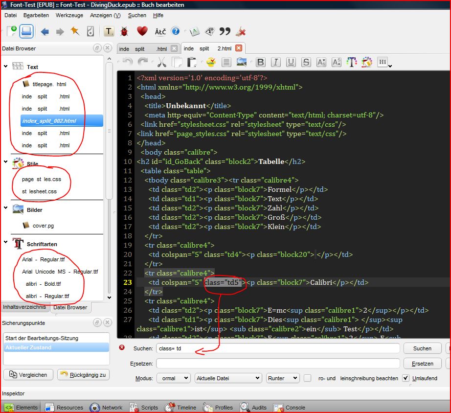 I have an interesting behavior of the Editor-GUI in combination with a EPUB for testing sub- and superscript capabilities of fonts. All used fonts in the EPUB are embedded and subsetted (please see attached EPUB). If you open this file with the editor, you will see missing characters in the file browser for nearly all files. Same, if you highlight a text (see picture) and go then to menu search -> Find Replace . Some of the menu entries have as well missing characters. It looks like the included subsetted fonts in the EPUB are altering the font of the Editor-GUI. This happen only with this test file and I did not saw this behavior anytime before. |