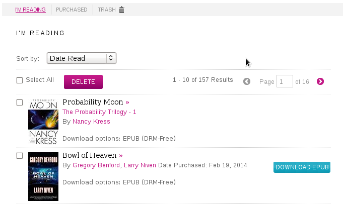 The screenshot attached is from my library, the book at the top is a preview, the one below it is a purchased book. The download options show that after purchase the book will be available for download as a DRM-free epub. |