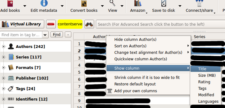 Clicking around to learn about it, the column with book titles disappeared. And darned if I can figure out how to restore them. This happened a few weeks ago and I hope no one will ask me what I did that caused the bungle - I don't know now. |