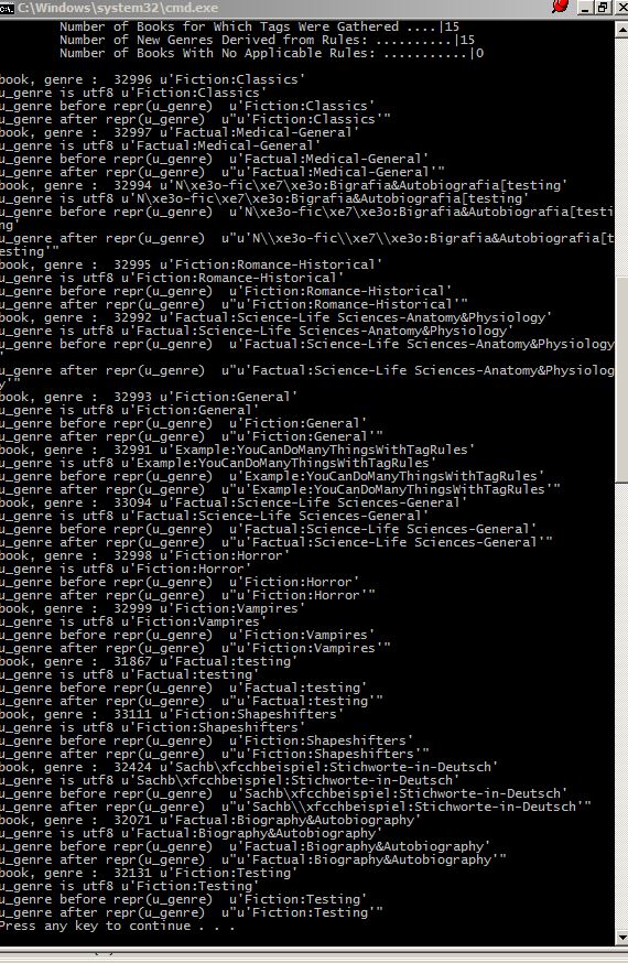 id_map = {} for book, genre in book_new_genre_final.items(): #print("book, genre : ", book, genre) mi = Metadata(_('Unknown')) u_book = book #still in utf8 u_genre = genre #still in utf8 n_book = int(u_book) if isinstance(u_genre, bytes): print("u_genre is bytes") else: if isinstance(u_genre, unicode): print("u_genre is utf8") else: print("u_genre is something else...") if n_book > 0 and u_genre > ' ': All of the output said "u_genre is utf8". Please look at the screen snippet from metadata.db, which is also attached. Note the complex characters that only unicode can support, such as German umlauts and the Portuguese word. Last edited by DaltonST; 07-23-2014 at 11:46 AM. Reason: Changed code to show latest version |