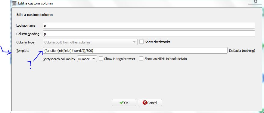 UPDATE: See solution as of post #13 on 9/2. ORIGINAL POST: I've looked through this info. I've managed with some of it, but this part is beyond me right now. I think I can handle making the column, but I need the FUNCTION string to make it work. My goal is do a math problem using 1 existing custom column. I have these 2 columns: #pages and #words These are populated by the Count Pages plug-in. However, #pages uses characters to determine the number of pages. I want to be be able to relate to the digital book better based on traditional formatting of printed non-educational and non-art books sized between 5.5in to 6"x9" in English. I've researched many "facts" and opinions on the average number of words per pages in these traditional printed formats. I've settle on using 300 words per page as my number to determine a page count I can relate to. I'm already familiar with personal reading speed and can relate that to word count, but this would be a really nice feature if someone can help make it happen. It could also be really helpful to self-publishers. Essentially, I need a column that does this math: #words/300 and returns the numeric value rounded up if possible. Can anyone construct this string for my custom column? Last edited by jecilop; 09-02-2014 at 03:15 AM. Reason: Update |