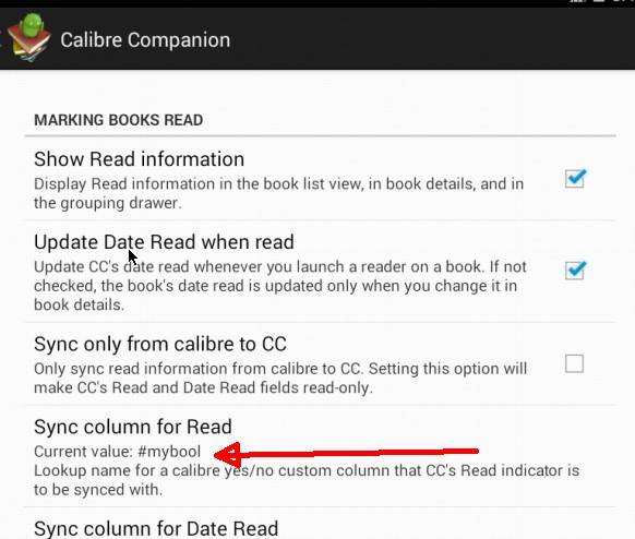 To sync CC's read information back to calibre: 1) You must create a yes/no custom column in calibre. Make a note of the lookup name. In this example the lookup name I am using is #mybool 2) In CC's settings go to the Marking Books Read section and tap on Sync column for Read 3) Enter the exact spelling of the lookup name of the calibre yes/no custom column in the dialog box. 4) You now see the lookup name of the calibre column in CC's settings. From this point on, when you connect as a wireless device CC's read information will be sent to calibre and put into the custom column with the lookup name you used, in this example #mybool. Information in that custom column will be sent to CC and put into CC's read info. Quote: