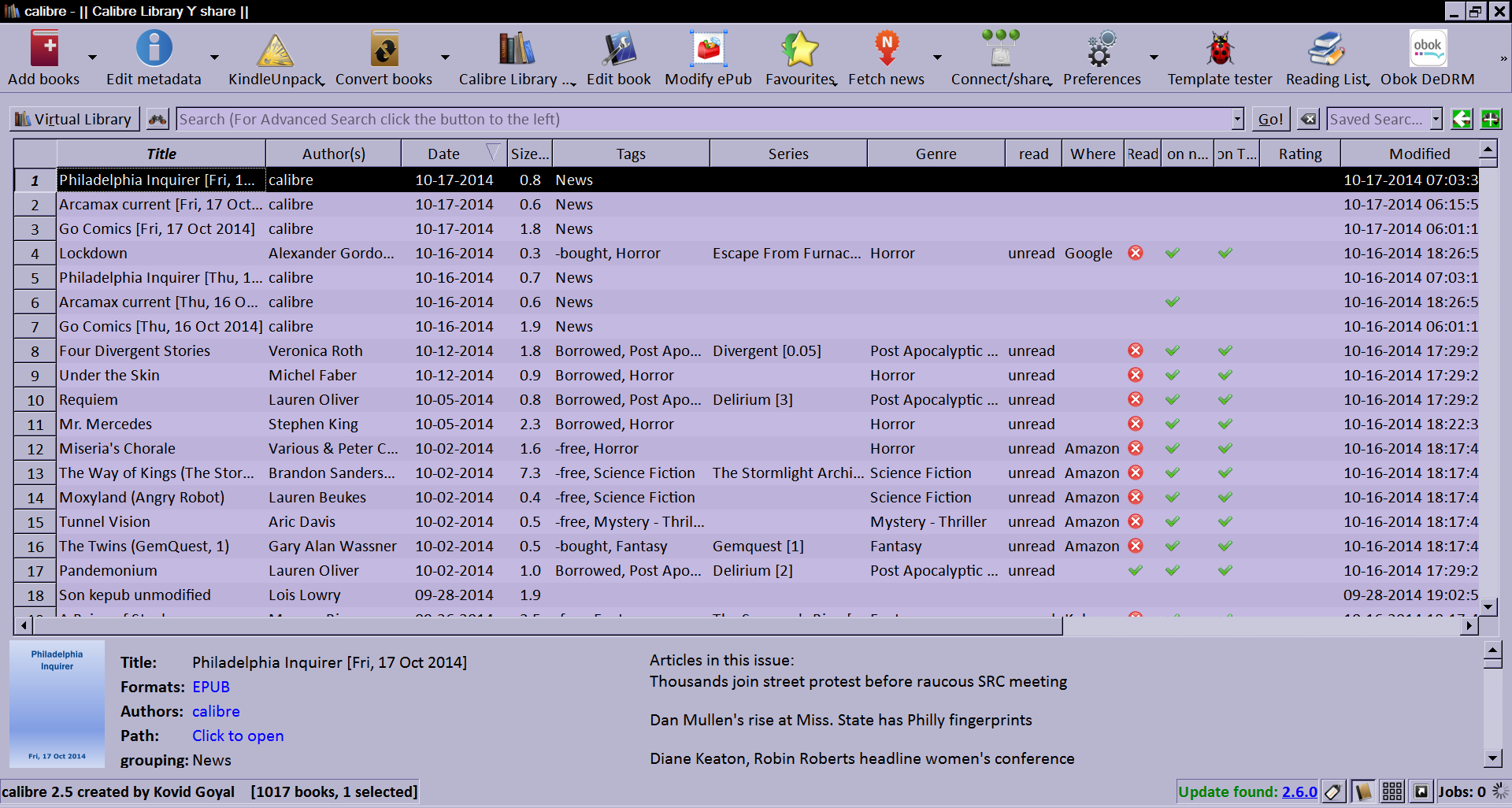 The issue is that Calibre does not properly handle the case where a user is using a high-contrast theme. This is pretty standard stuff. I did finally manage to find the preferences settings. The problem with THAT is that the widget that Calibre uses to "drop down" anything that doesn't fit on the tool bar is invisible in a high contrast theme. It is very thin and all the way to the right so unless you position your cursor JUST RIGHT (and in order to do that it helps if you magically already know where the invisible widget is) you can't get to preferences or any other tool that doesn't fit within the width of the window. I had to maximize the window to find preferences. Preferences allows me to set either "calibre style" or "windows standard style" (or something like that). Setting that to "windows standard" or whatever it is - not the Calibre version at least - gets rid of the eye-stabbing alternating white bars in the library list. But regardless of which style you have selected, that widget to expand the tool bar is still invisible. Possibly there are other invisible widgets as well. Also the text colors for Authors, Series, IDS, and Tags in that little info window in the lower left of the calibre window is using a default bright royal blue (normal display) and bright red (for mouseover highlight) to display text. The blue color is unreadable on a dark background (mine is dark charcoal) and the red is pretty eye searing. Also for some bizarre reason, part of the last letter in the Series field, however long it is, is displayed in that bright red color. I would attach a picture - I did go to all the trouble to get one - but apparently this forum (which ALSO hasn't properly coded for high-contrast visually impaired folks because this editor has a bunch of invisible-in-high-contrast-mode widgets as well) won't insert a picture, it will only display a picture with an URL. So hopefully the developer will read this and fix his widgets so they're not invisible in high contrast mode, then fix the colors being used to display those links so they, too, are not illegible or painful to the user who must use a hight contrast theme. Or give us the option to change those colors in the appearance tab. That would probably be easiest for the user, and probably the coder as well. I'm not sure where those default colors are coming from, but I can't find a Windows setting that will change them - so please, please, PLEASE let those of us who need to use high-contrast settings fix it so we can actually see that text. |