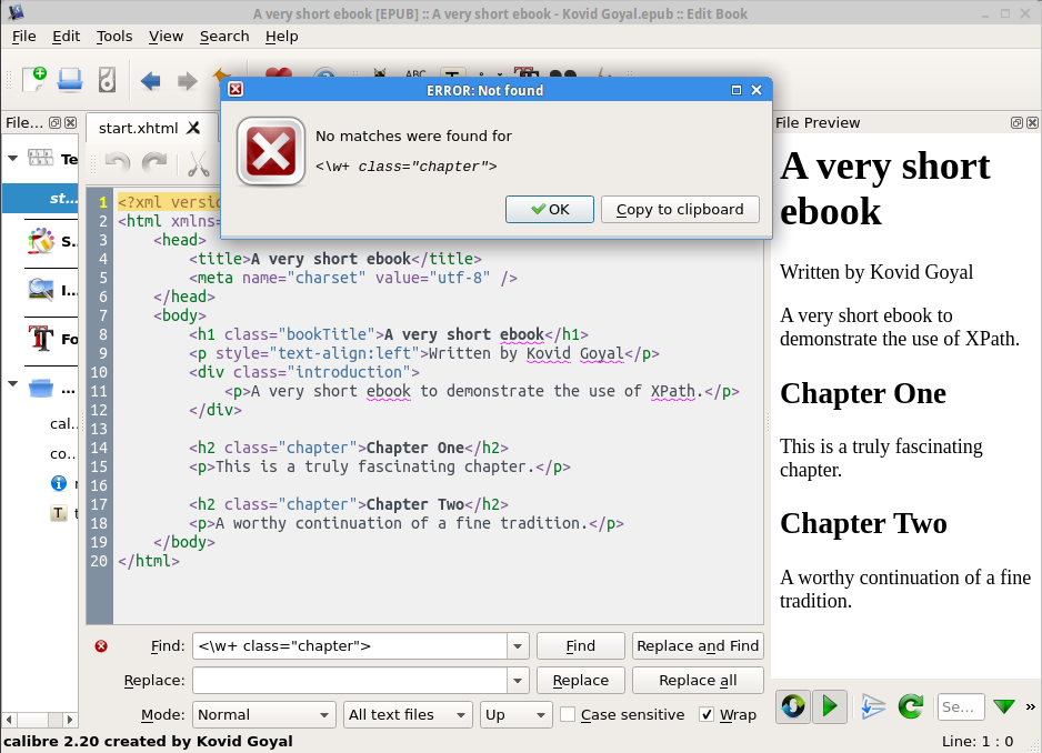In the F&R you can only use Regular Expressions http://manual.calibre-ebook.com/regexp.html Using eschwartz's RE you can find H2's with class="chapter" in the sample book (pic 2) I guess I'm not understanding why you were looking to use XPath. Sorry, but maybe you could provide a little more about what you were looking to do? Last edited by phossler; 02-27-2015 at 10:56 AM. |