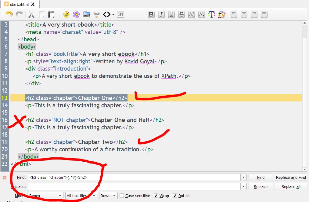 How can I let this 'Very short ebook' demonstrate me the use of XPath? No matter what search term // h: h2 or // * [@ class = "chapter"] or <h2( [^>]*)?> or <\w+ class="chapter"> the result is: No matches were found for ... That specific question needs more a practical answer. |