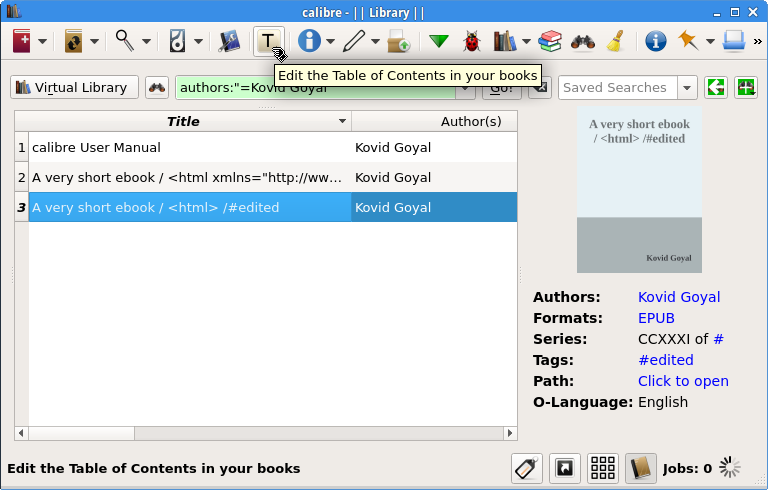 So you are quite right to mention the 'path': without Edit book window we wouldn't know the correct 'key phrases' to use (see Edit the ToC in ... (Start) after Fix HTML + Beautify current file) In a (very) small ebook creating the ToC its enough to fill the libprs500 window only HTML tags with tag names (like a, br, div, h1, h2 etc.) and ignore the attribute and value inputs. That's probably in bigger ebooks not to ignore in order to obtain a really sophisticated ToC (at moment I don't know). Here results the same if using only //h:h1 or (full expression) //h:h1[re:test(@class, "bookTitle", "i")] - tested. See Create ToC from XPath and the result Edit the ToC in ...(vers A). Note: The HTML tags div and h2 get id-numbers (both h2 different ones), but the HTML tag h1 gets none. Can you say something about? It's possible to customize the ToC, see Edit the ToC in ...(vers B) Quote: