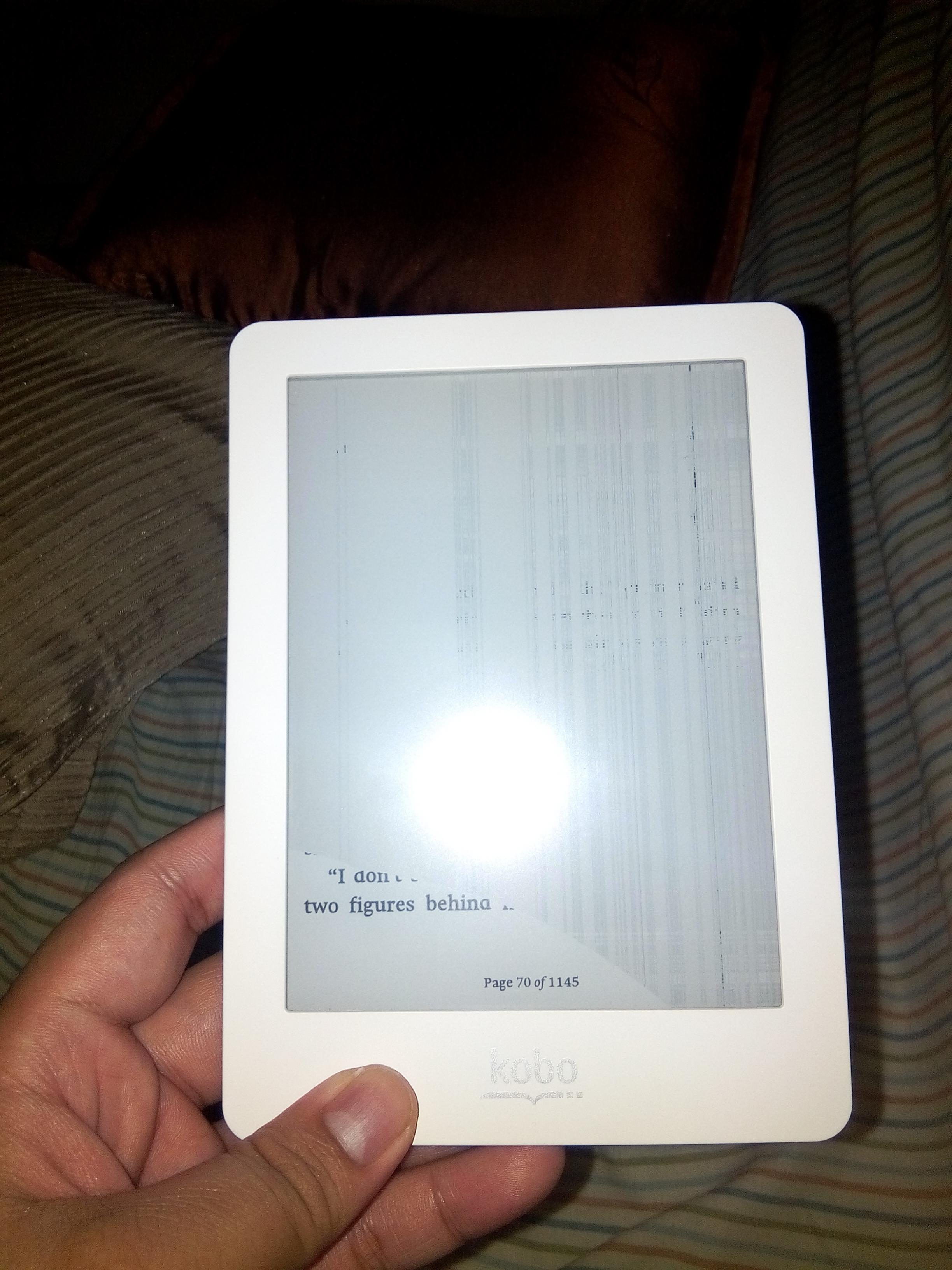 I woke up in the middle of the night to find my Glo at the edge of my bed. And when I turned it on it looked like this. It doesn't have any noticeable cracks on the screen and it definitely doesn't look broken. At this point, I'm willing to try anything because you can only buy the Touch here. They stopped selling the Glo when Kobo stopped making them.  |