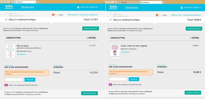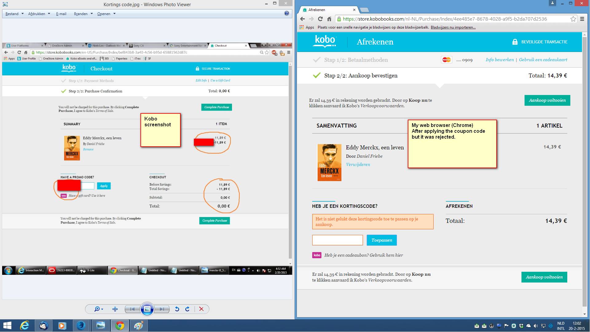 The answer of Kobo: the code does work on all three books. They also gave me the advice to use a different browser: use Google Chrome. I had already tried this several times befrore, but I don't mind that they suggest it. It is worth a(nother) try. So, I tried again. This time with both Chrome and Internet Explorer instead of Firefox. But the code still does not work. All browsers are up to date. At Kobos end the codes do work (see screenshot #4) but not on the users end. This must be a rights issue. Take also note of the different pricing. Different store. Different pricing. Working coupon code. Not working coupon code. Last edited by Anak; 02-20-2015 at 07:36 AM. |