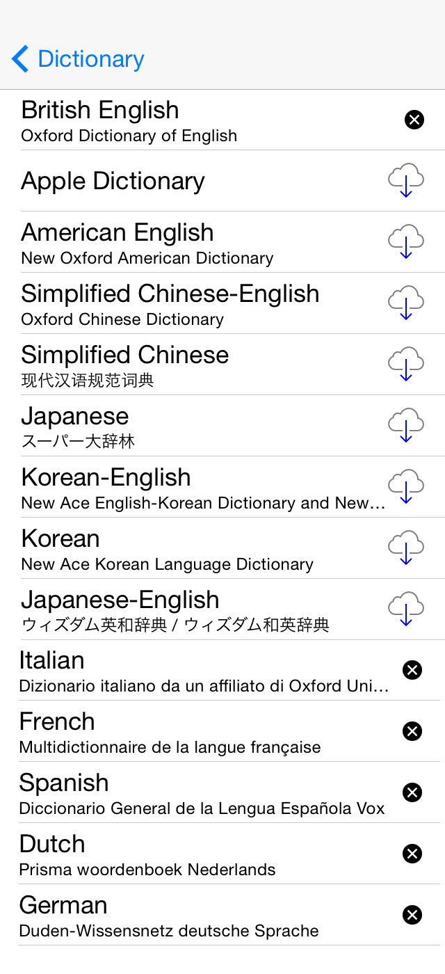 iOS devices come with monolingual English, French, Italian, Spanish, Dutch, Chinese, Japanese and Korean dictionaries and bilingual Chinese, Japanese and Korean dictionaries. For details, see the screen capture.