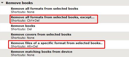 for example: if I click on the "remove books" icon it performs the "remove selected books" action. I would like it to perform the "remove books of a specific format" action. I've found Preferences/Keyboard/Remove Books, but this has only allowed me to change the "Del" keyboard shortcut. Thanks. |