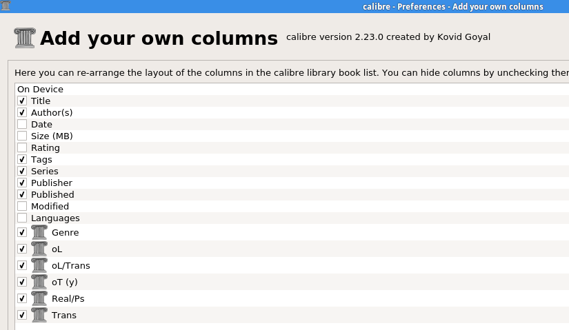 ![]() My OS (Xubuntu) gets reinstalled from scratch. What should I consider in relation to my customized settings of calibre. First of all I backed up my whole library. That includes that metadata_db_prefs_backup.json text document where e.g. I can find my CCs again. CC trans (Translater) is highlighted. Each book gots (as you know) his own metadata.opf file. I show the content of Die Kinder des Zorns (GE) - Jeppe Aakjaer.epub This XML file does not appear to have any style information associated with it. The document tree is shown below. <package xmlns="http://www.idpf.org/2007/opf" unique-identifier="uuid_id" version="2.0"> <metadata xmlns:dc="http://purl.org/dc/elements/1.1/" xmlns pf="http://www.idpf.org/2007/opf"><dc:identifier opf:scheme="calibre" id="calibre_id">10642</dc:identifier> <dc:identifier opf:scheme="uuid" id="uuid_id">02ae0cca-c4e8-4bb2-a737-8c24eee69aeb</dc:identifier> <dc:title>Die Kinder des Zorns (GE)</dc:title> <dc:creator opf:file-as="AAKJÆR, JEPPE" opf:role="aut">Jeppe Aakjær</dc:creator> <dc:contributor opf:file-as="calibre" opf:role="bkp">calibre (2.22.0) [http://calibre-ebook.com]</dc:contributor> <dc:date>0101-01-01T00:00:00+00:00</dc:date> <dc:description> <a href="http://de.wikipedia.org/wiki/Jeppe_Aakj%C3%A6r">Jeppe Aakjær</a> </dc:description> <dc ublisher>ngiyaw eBooks</dc ublisher><dc:language>deu</dc:language> <dc:subject>Roman</dc:subject> <meta content="{"Jeppe Aakjær": ""}" name="calibre:author_link_map"/> <meta content="#" name="calibre:series"/> <meta content="1" name="calibre:series_index"/> <meta content="0101-01-01T00:00:00+00:00" name="calibre:timestamp"/> <meta content="Kinder des Zorns (GE), Die" name="calibre:title_sort"/> <meta name="calibre:user_metadata:#real_pseudo_cst_cn_c" content="{"display": {"description": "", "is_names": true}, "label": "real_pseudo_cst_cn_c", "#value#": ["Jeppe Jensen"], "table": "custom_column_16", "is_category": true, "is_custom": true, "rec_index": 26, "kind": "field", "name": "Real/Ps", "datatype": "text", "#extra#": null, "column": "value", "link_column": "value", "category_sort": "value", "search_terms": ["#real_pseudo_cst_cn_c"], "is_editable": true, "is_multiple2": {"cache_to_list": "|", "ui_to_list": "&", "list_to_ui": " & "}, "colnum": 16, "is_csp": false, "is_multiple": "|"}"/> <meta name="calibre:user_metadata:#origtitle_year_t_sc_c" content="{"display": {"description": "Originaltitel (Erscheinungsjahr)", "use_decorations": 2}, "label": "origtitle_year_t_sc_c", "#value#": "Vredens børn (1912)", "table": "custom_column_9", "is_category": true, "is_custom": true, "rec_index": 25, "kind": "field", "name": "oT (y)", "datatype": "text", "#extra#": null, "column": "value", "link_column": "value", "category_sort": "value", "search_terms": ["#origtitle_year_t_sc_c"], "is_editable": true, "is_multiple2": {}, "colnum": 9, "is_csp": false, "is_multiple": null}"/> <meta name="calibre:user_metadata:#origlang_t_sc_c" content="{"display": {"description": "", "use_decorations": 2}, "label": "origlang_t_sc_c", "#value#": "Danish", "table": "custom_column_24", "is_category": true, "is_custom": true, "rec_index": 23, "kind": "field", "name": "oL", "datatype": "text", "#extra#": null, "column": "value", "link_column": "value", "category_sort": "value", "search_terms": ["#origlang_t_sc_c"], "is_editable": true, "is_multiple2": {}, "colnum": 24, "is_csp": false, "is_multiple": null}"/> <meta name="calibre:user_metadata:#origlang_trans_cst_cn_unc" content="{"display": {"description": "", "is_names": false}, "label": "origlang_trans_cst_cn_unc", "#value#": ["Danish.Erich Holm"], "table": "custom_column_19", "is_category": true, "is_custom": true, "rec_index": 24, "kind": "field", "name": "oL/Trans", "datatype": "text", "#extra#": null, "column": "value", "link_column": "value", "category_sort": "value", "search_terms": ["#origlang_trans_cst_cn_unc"], "is_editable": true, "is_multiple2": {"cache_to_list": "|", "ui_to_list": ",", "list_to_ui": ", "}, "colnum": 19, "is_csp": false, "is_multiple": "|"}"/> <meta name="calibre:user_metadata:#trans_cst_cn_c" content="{"display": {"description": "", "is_names": true}, "label": "trans_cst_cn_c", "#value#": ["Erich Holm"], "table": "custom_column_15", "is_category": true, "is_custom": true, "rec_index": 27, "kind": "field", "name": "Trans", "datatype": "text", "#extra#": null, "column": "value", "link_column": "value", "category_sort": "value", "search_terms": ["#trans_cst_cn_c"], "is_editable": true, "is_multiple2": {"cache_to_list": "|", "ui_to_list": "&", "list_to_ui": " & "}, "colnum": 15, "is_csp": false, "is_multiple": "|"}"/> <meta name="calibre:user_metadata:#genre_cst_cn_unc" content="{"display": {"description": "", "is_names": false}, "label": "genre_cst_cn_unc", "#value#": [], "table": "custom_column_23", "is_category": true, "is_custom": true, "rec_index": 22, "kind": "field", "name": "Genre", "datatype": "text", "#extra#": null, "column": "value", "link_column": "value", "category_sort": "value", "search_terms": ["#genre_cst_cn_unc"], "is_editable": true, "is_multiple2": {"cache_to_list": "|", "ui_to_list": ",", "list_to_ui": ", "}, "colnum": 23, "is_csp": false, "is_multiple": "|"}"/> </metadata> <guide> <reference href="cover.jpg" title="Cover" type="cover"/> </guide> </package> I got 6 CCs (marked red). I copied my /home/... files - that includes e.g. that here mentioned file. /.config/calibre/resources/images After reinstall (basic) calibre I will probably have to reinstall all my CCs again. Does calibre uses then this documents and files to set up the same interface which I see currently? What else should I consider? Last edited by chaot; 04-07-2015 at 11:16 AM. |