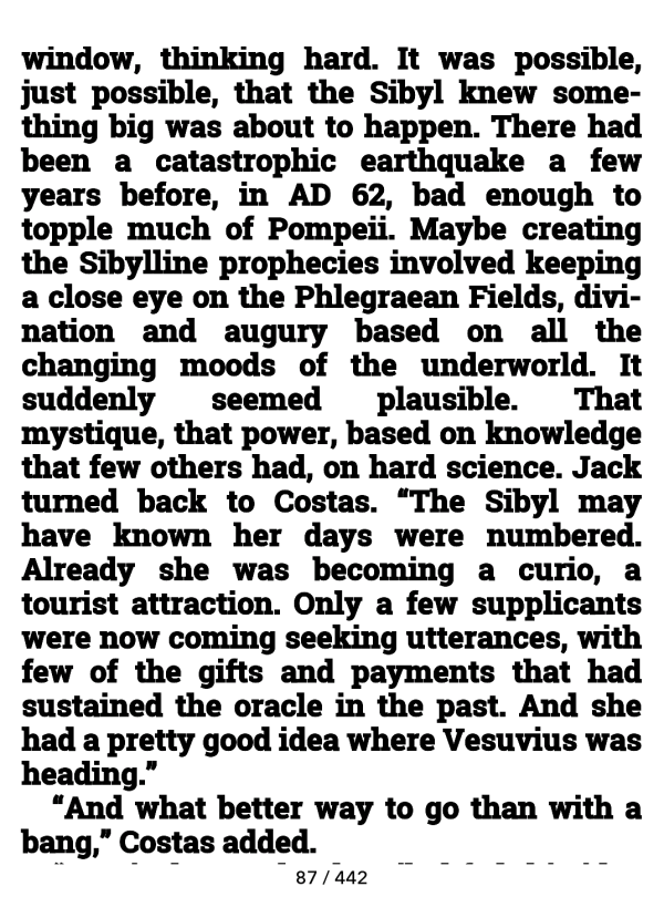 I don't like the book title on top, but I do want to see the page numbers. This view however leaves you with a blank line or 2 where the book title would normally be. If you use full page, where you eliminate both the title and page numbers, it doesn't happen and you do get full use of the entire screen without that blank space at the top. It's not extreme though and I could live with this if it was the only problem. But what I can't live with is that every single page has the bottom showing 1 pixel of the top of the next page's text, and then on the next page, the tops are cut off by that same amount, and I haven't found any way to get rid of it. Surprisingly I never see the problem I've read about from others where the right side of text is chopped off at times. The 2 kepub screenshots show that bottom chopped text. Quote: