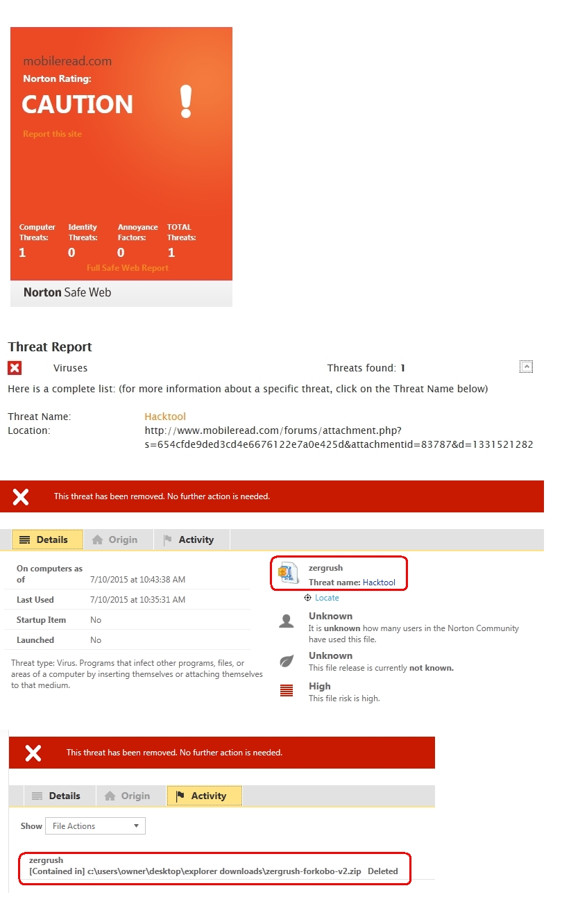 All is well ... Norton has removed the alert from MobileRead website. Another false positive bites the dust! ========================================= UPDATE: FALSE ALARM FROM NORTON The file was originally posted back in 2012! Norton probably updated a virus definition incorrectly. SORRY! ============================================== Norton Security set off an alarm when I logged into MobileRead a few minutes ago. I did some further digging, and Norton has a problem with a zip file: "ZergRush-forKobo-v2.zip" Norton provided this URL for the file: https://www.mobileread.com/forums/att...7&d=1331521282 Info from Norton is attached. MODERATOR: I'm NOT a virus guru and can't confirm that there really is a problem with the file. Check it out ... if the zip does indeed contain a "nasty", do what's appropriate! Last edited by MartyTX; 07-11-2015 at 11:55 AM. Reason: Norton alert is gone |