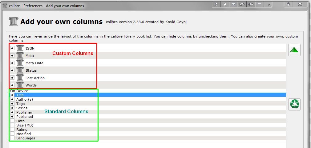 And, yes, when I connected CC to Calibre, I saw a message about metaschema that flashed by and then it showed updating 65 records, which is the number which I had modified. If I look in CC at one of the books I updated I see a blank Read column at the top and then at the very bottom there is another Read label and that contains Ref, which is the code I put in to reflect presence in a Kindle collection for Reference material. But, what is the solution now? Suppose I re-title the field I have as Status or Collection ... since it does correspond to Kindle Collection ... ah, but then I see that my Kindle Collection column is already there. Can I add Kindle Collection to the Grouping? If not, I suppose I can discard the field I have, since it is redundant with Kindle Collection, and create a new field for Read of the yes/no variety. |