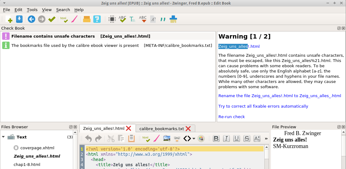 The theme (dealing with errors, warnings and infos) isn't new. (Link will follow, must first be found.) At that time we did not get on, also because my approach was wrong or not at least clearly formulated. Still I think there is something lets say may be optimizable. But I'm not sure of what would be correct to fix it. WARNING: Filename contains unsafe characters [Zeig_uns_alles!.html] Description: The filename Zeig_uns_alles!_split_000.html contains unsafe characters, that must be escaped, like this Zeig_uns_alles%21_split_000.html. This can cause problems with some ebook readers. To be absolutely safe, use only the English alphabet [a-z], the numbers [0-9], underscores and hyphens in your file names. While many other characters are allowed, they may cause problems with some software. The problem is clear, the unsafe character is the exclamation mark ! 2 Solution Offers: Rename the file Zeig_uns_alles!.html to Zeig_uns_alles_.html Try to correct all fixable errors automatically Second, no Warning, but an Info. INFO: The bookmarks file used by the calibre ebook viewer is present [META-INF/calibre_bookmarks.txt] Description: This file stores the bookmarks and last opened information from the calibre ebook viewer. You can remove it if you do not need that information, or don't want to share it with other people you send this book to. 2 Solution Offers: Remove this file Try to correct all fixable errors automatically So far everything looks fine. Now I come to the point. I click Try to correct all fixable errors automatically and would expect to see (at least only) the correction of the first event, the warning. But that is so not the case. The bookmarks will be deleted too. Result No problems found Beside of that an info is not a error, even a warning isn't one, I would like to keep my bookmarks. The deleting of the bookmarks is one of the points in mind what I see here as wrong! Last edited by chaot; 10-22-2015 at 03:37 PM. Reason: Title change |