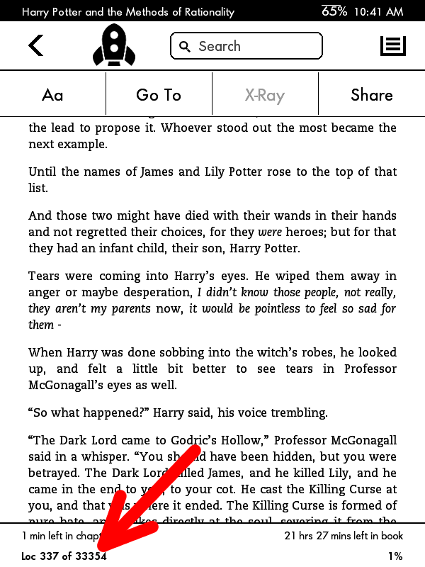 IIRC pagenumbers have been supported since the Kindle Keyboard on fw3.4 And up until the Kindle Touch (my device) on fw5.3.7, it is entirely possible to have no pagenumbers. In fact, I am pretty sure I have seen them missing on other peoples' PW2s as well. Anyway, I'd've heard if things changed. ![]() Anyway, some screenshots. As a fellow hater of ereaders-lying-about-having-real-pagenumbers, I am used to praising Amazon for not using them unless they actually exist. ![]() If you are seeing "Page x of y", I really do think it must be because you did not clean out the ancillary files from your Kindle before resending the book. Either that or double-check that the Kindle Driver setting to disable pseudo-APNX generation is actually disabled. Quick check -- take a new book that has never been on your Kindle, send it with calibre, then find the book on your Kindle, and see if there is an APNX next to it (in the *.sdr folder). Then and only then, unplug the Kindle and check if that book has "Page x of y" showing. "Loc x of y" is NOT a pagenumber! It is a file offset, I'm not sure how Amazon calculates them but it is done dynamically and can pinpoint an actual sentence, not just a general page. |