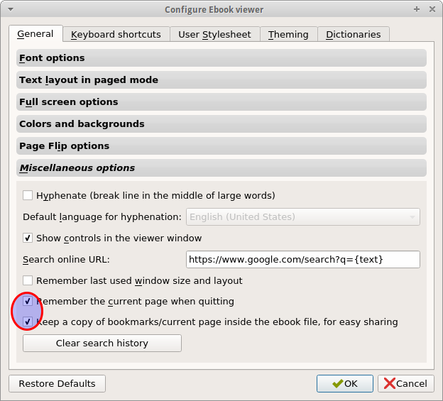 Configure e-book viewer Calibre Manual is (as usual) not or less useful. See Bookmarks